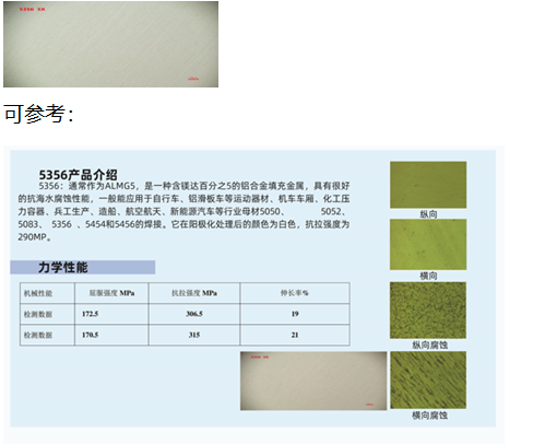 5356:通常作为ALMg5,是一种含镁达百分之5的铝合金填充金属,具有很好的抗海水腐蚀性能,一般能应用于自行车、铝滑板车等运动器材、机车车厢、化工压力容器、兵工生产、造船、航空航天、新能源汽车等行业母材5050、 5052、 5083、 5356 、5454和5456的焊接。它在阳极化处理后的颜色为白色,抗拉强度为290MP。